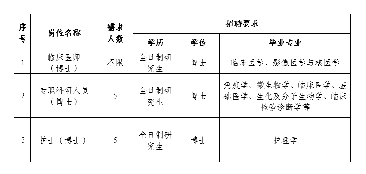 因医院工作需要,面向社会公开招聘一批博士研究生。现就有关事项公告如下: