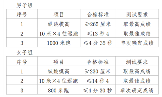 1.体能测评项目及通过标准:纵跳摸高、10米×4往返跑、男子组1000米跑、女子组800米跑。