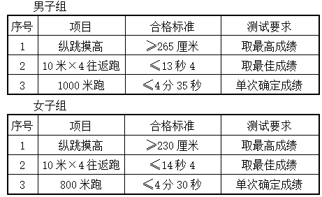 体能测评项目及通过标准:纵跳摸高、10米×4往返跑、男子组1000米跑、女子组800米跑。