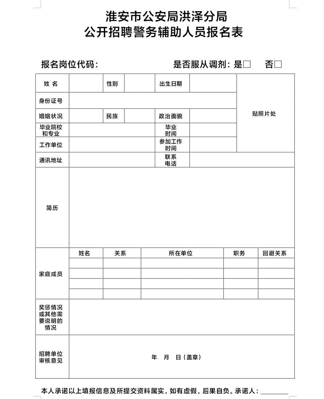 本次面向社会公开招聘警务辅助人员,采取现场报名方式进行(自行下载打印报名表并填写完整),报名地点:淮安市洪泽区洪泽湖大道98号(淮安市公安局洪泽分局111室)。报名需提供身份证、学历证书、各类技术职称证书,退伍军人需提供退伍军人证明等有效证件原件及复印件和中国人民银行出具的近期《个人信用报告》一份,以上报名材料报名时必须带齐。