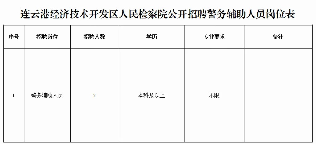 详见附件1《连云港经济技术开发区人民检察院公开招聘警务辅助人员公告岗位表》(以下简称《岗位表》)。