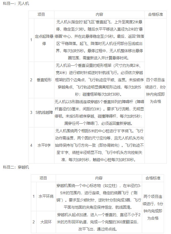 (2)专业科目测试标准:参考中国民用航空局2024年印发的《民用无人驾驶航空器操控员执照考试管理办法》,主要考察应聘人员是否熟练掌握无人机或穿越机起飞、悬停、水平环绕、八字环绕等基础操控技能。具体标准如下: