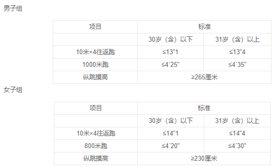 备注:年龄计算时间截至到参加体能测试当月。10米×4往返跑每人最多可测2次,男子1000米跑/女子800米跑每人最多可测1次,纵跳摸高最多可测3次。