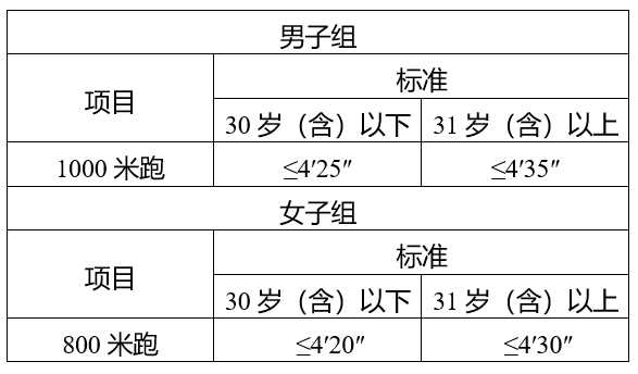 体测项目为男子1000米跑、女子800米跑,相关标准参照《公安机关录用人民警察体能测评项目和标准》。体能测评不合格的,取消进入下一环节资格。